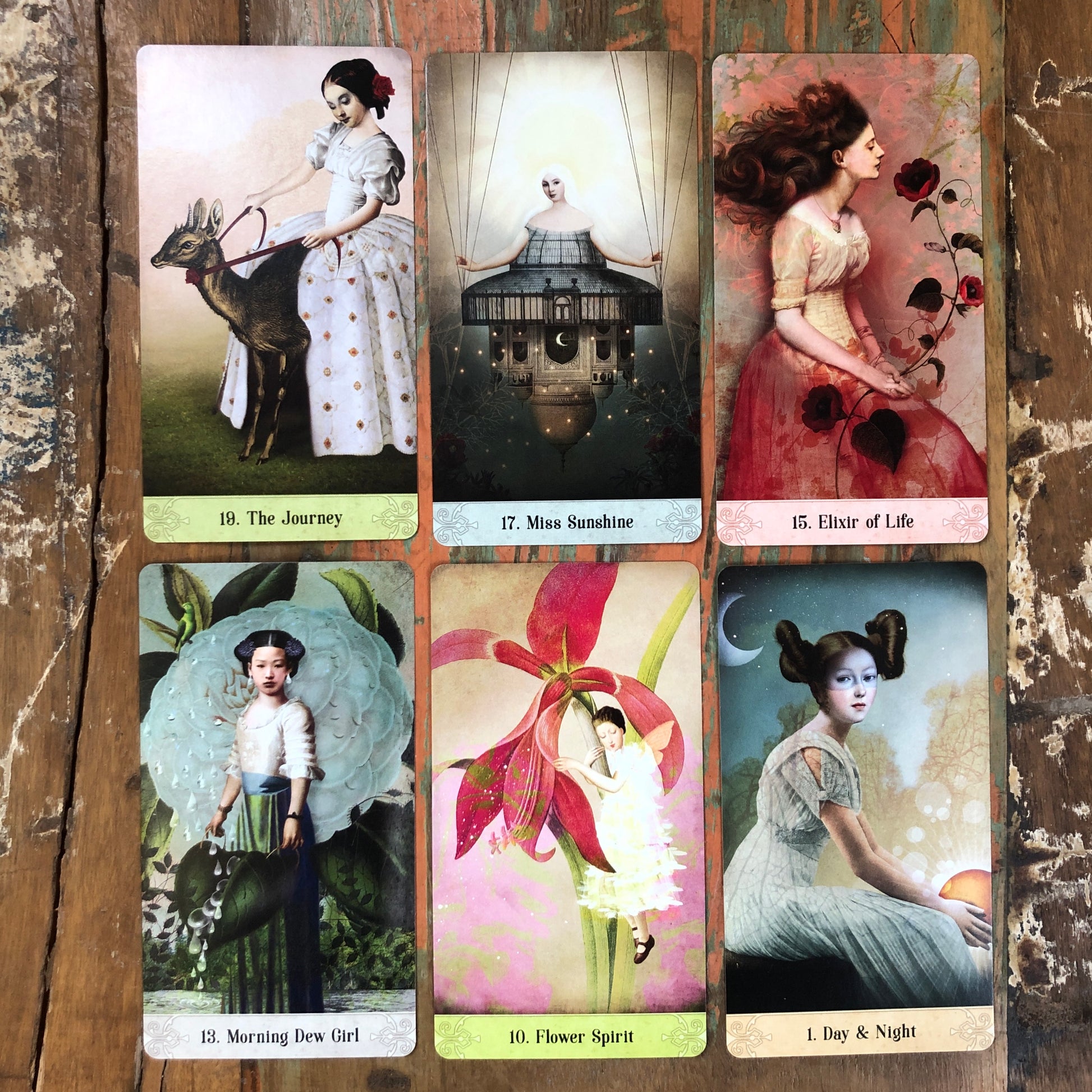 Description: Oracle of Mystical Moments intermixes unexpected elements of nature and imagination, creating a sumptuous world where flower spirits and floating castles happily co-exist.